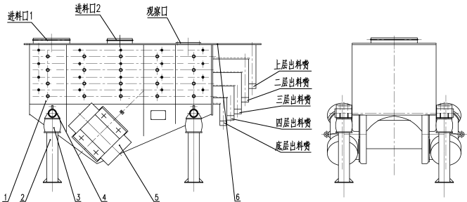 1.筛箱 2.减振簧座 3.减振簧 4.上弹簧座 5.振动电机 6.上盖