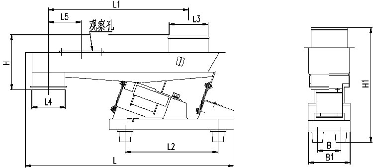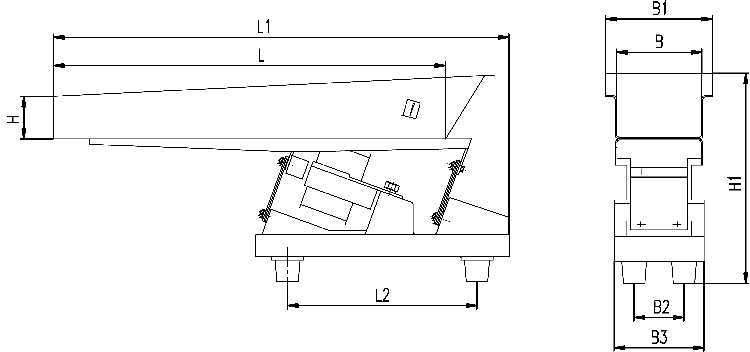 电磁振动给料机的振幅和给料量受料仓仓压影响较大,设计料仓时应尽量减少仓压,使溜咀后侧板承受仓压,并设置斜溜沮及下料闸门。如图,一般a=1/4b。溜咀四周应与给料槽留有间隙,一般5~10mm,以免产生噪音及影响振动。