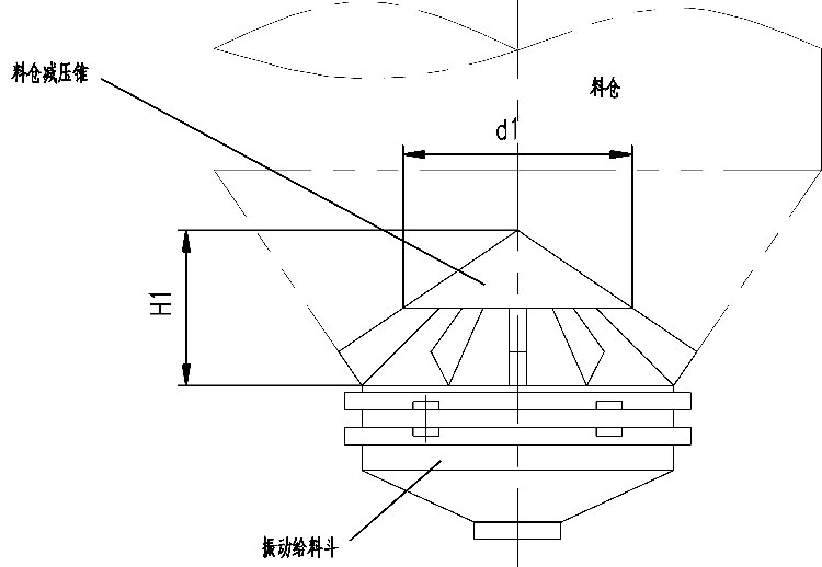 该产品在设计计算中已考虑了仓压,但建议在料仓内物料大于2m时,在料仓内安装料仓减压锥,以使振动给料斗稳定地工作。料仓减压锥应焊接在料仓内。